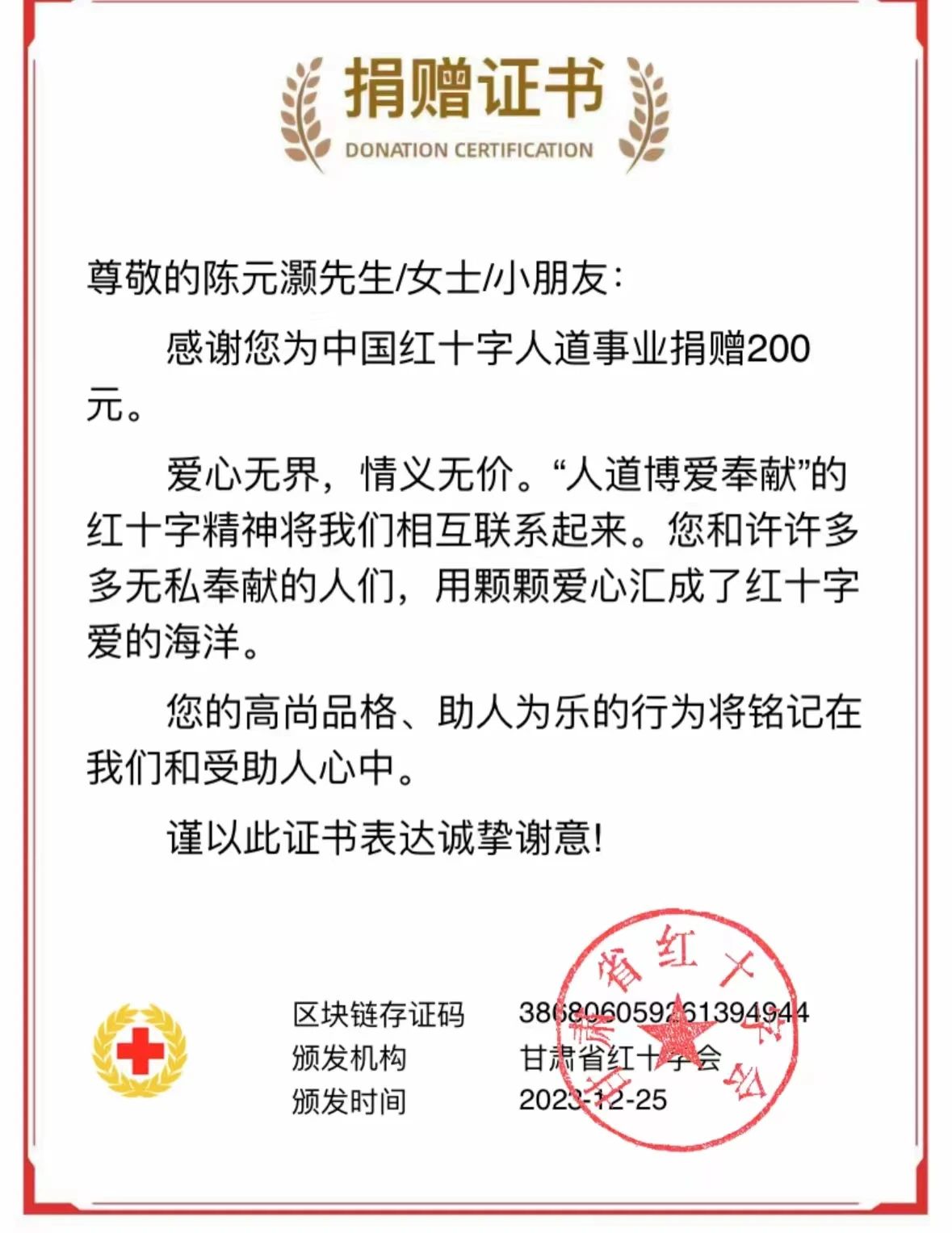 前段时间甘肃地震,我尽绵薄之力为社会做出贡献。虽然捐款不多但是我为慈善事业尽一份力,让温暖传递给更多需要帮助的人。(陈元灏)