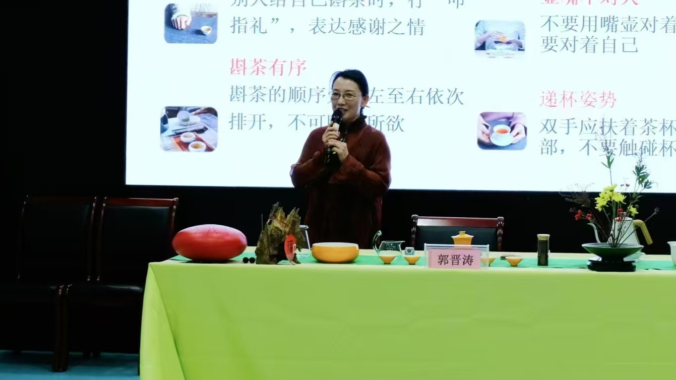 茶文化作为中华优秀传统文化的重要组成部分,蕴含了深邃的人生哲理、丰富的礼仪规范以及独特的审美情趣,如以茶示礼、以茶养心、以茶倡廉、以茶作诗等,表现形式多样。伴随着悠扬婉转的古琴声,郭老师娓娓道来。从中华茶祖神农氏“得荼”到古代茶文化的兴起,再到现代社会茶的普及;从茶性到茶礼,再到茶德,郭老师带领大家走进茶的世界,充分领略中华茶文化的独特魅力。