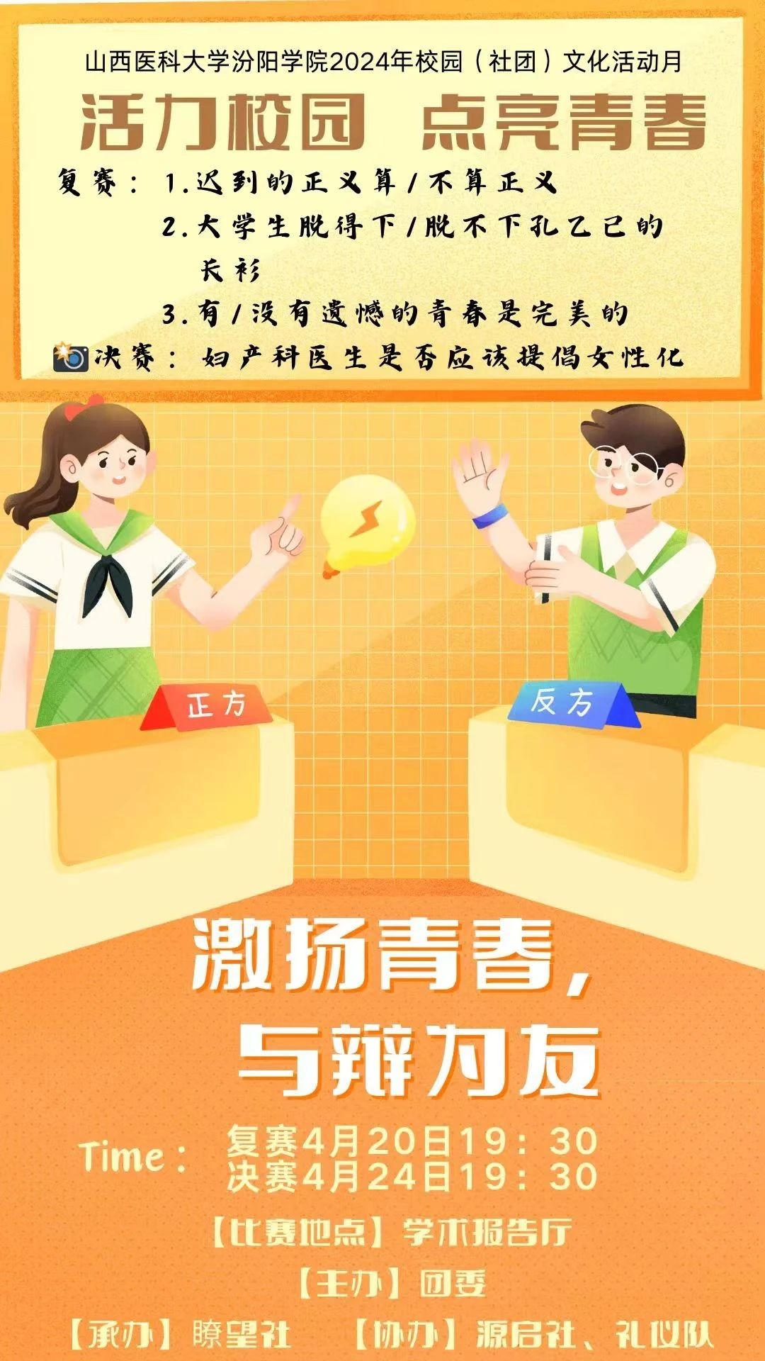 为丰富校园文化活动,提高学生思辨能力、语言表达能力、知识面以及团队协作能力。由校团委主办,瞭望社承办,源启社、礼仪队协办的“激扬青春,与辩为友”校园辩论赛经过前期报名等充分准备,于 4月13日拉开了初赛帷幕。4月20日进行了复赛。