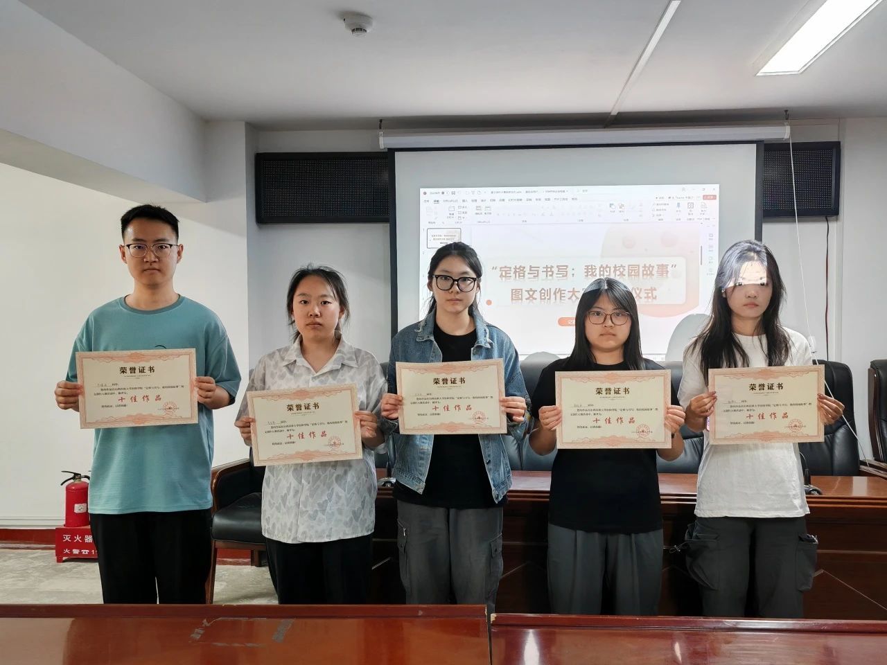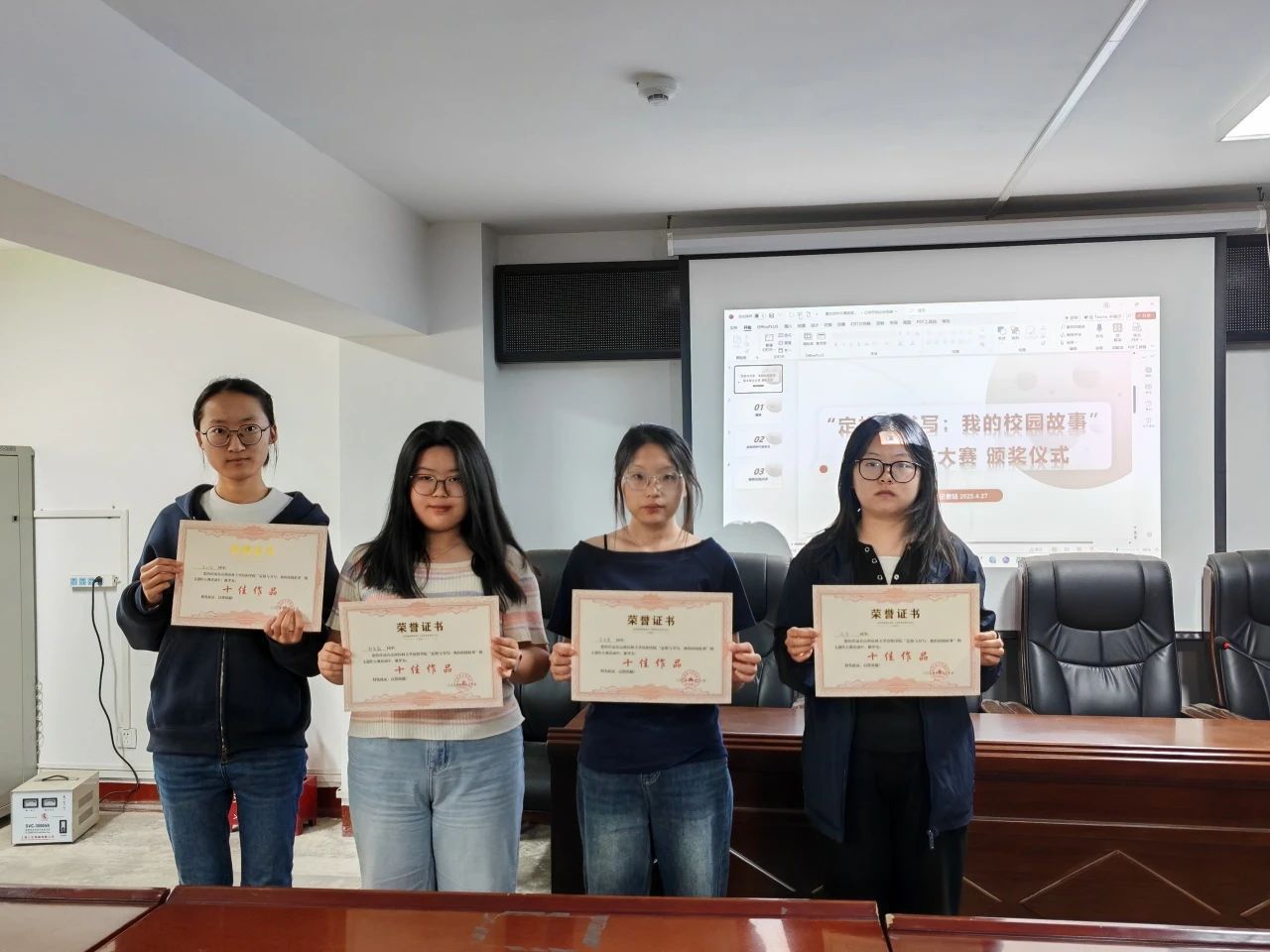 4月27日晚,记者站在敦学楼校学生会二楼举行了本次大赛的颁奖仪式。记者站指导老师武霞和刘慧姣出席了颁奖仪式。获奖同学和记者站全体成员参加了颁奖仪式。