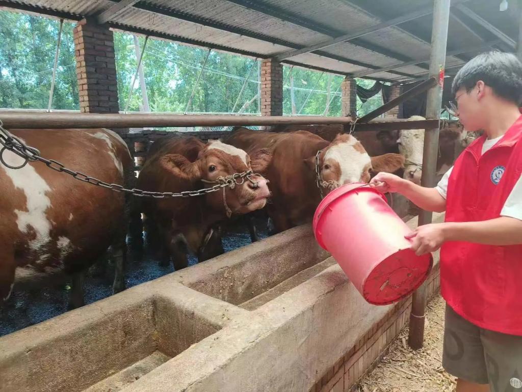 马二村根据我国产业基础和乡村资源积极发展生态养殖业,促进乡村振兴给老百姓增加收益,点亮发展乡村标准化致富路。7月13日,队员们走进养殖户卫柱一家,村民们热情地为队员们讲述养殖技巧与日常消毒工作,队员们更是积极地帮助工作人员进行饲养工作,同学们在整个过程中体会到了不一样的生活经历,偌大的牛场打理以及现代化设备的使用让同学们不禁感受到国家科技的发展与劳动人民的伟大。