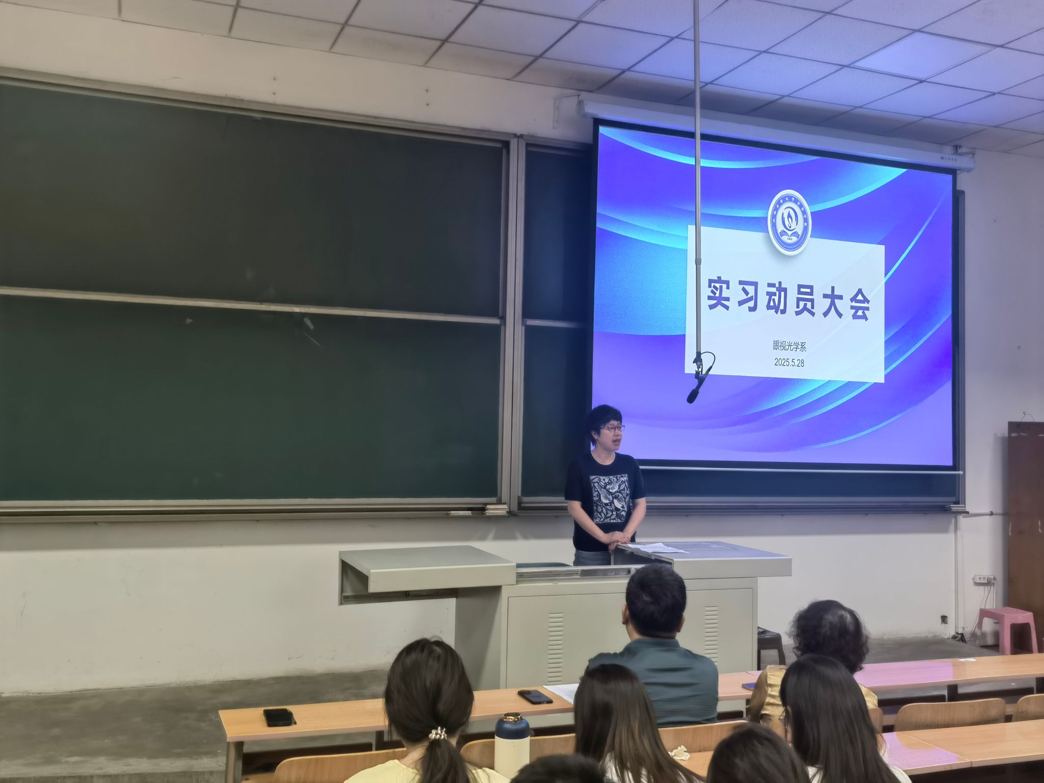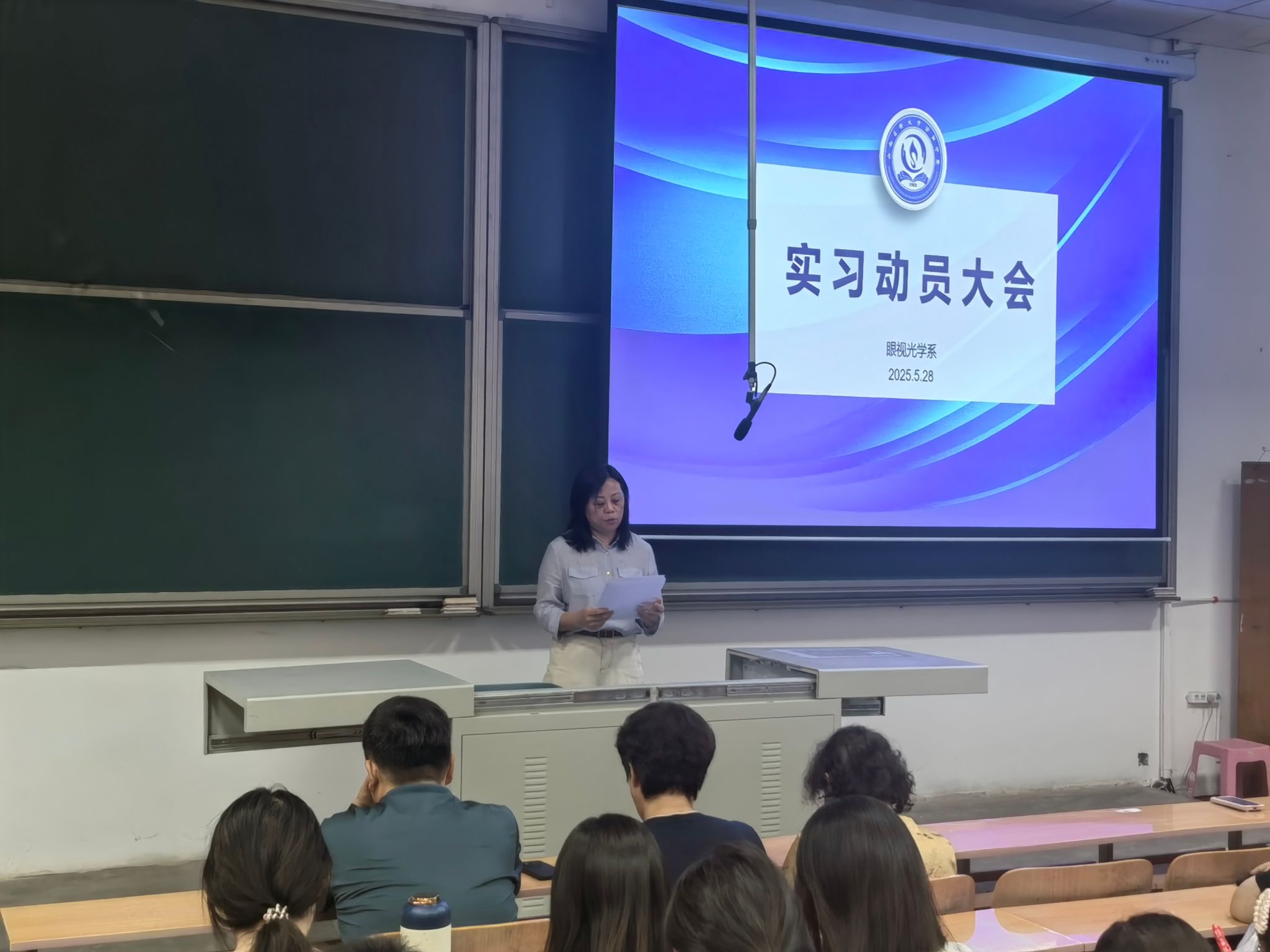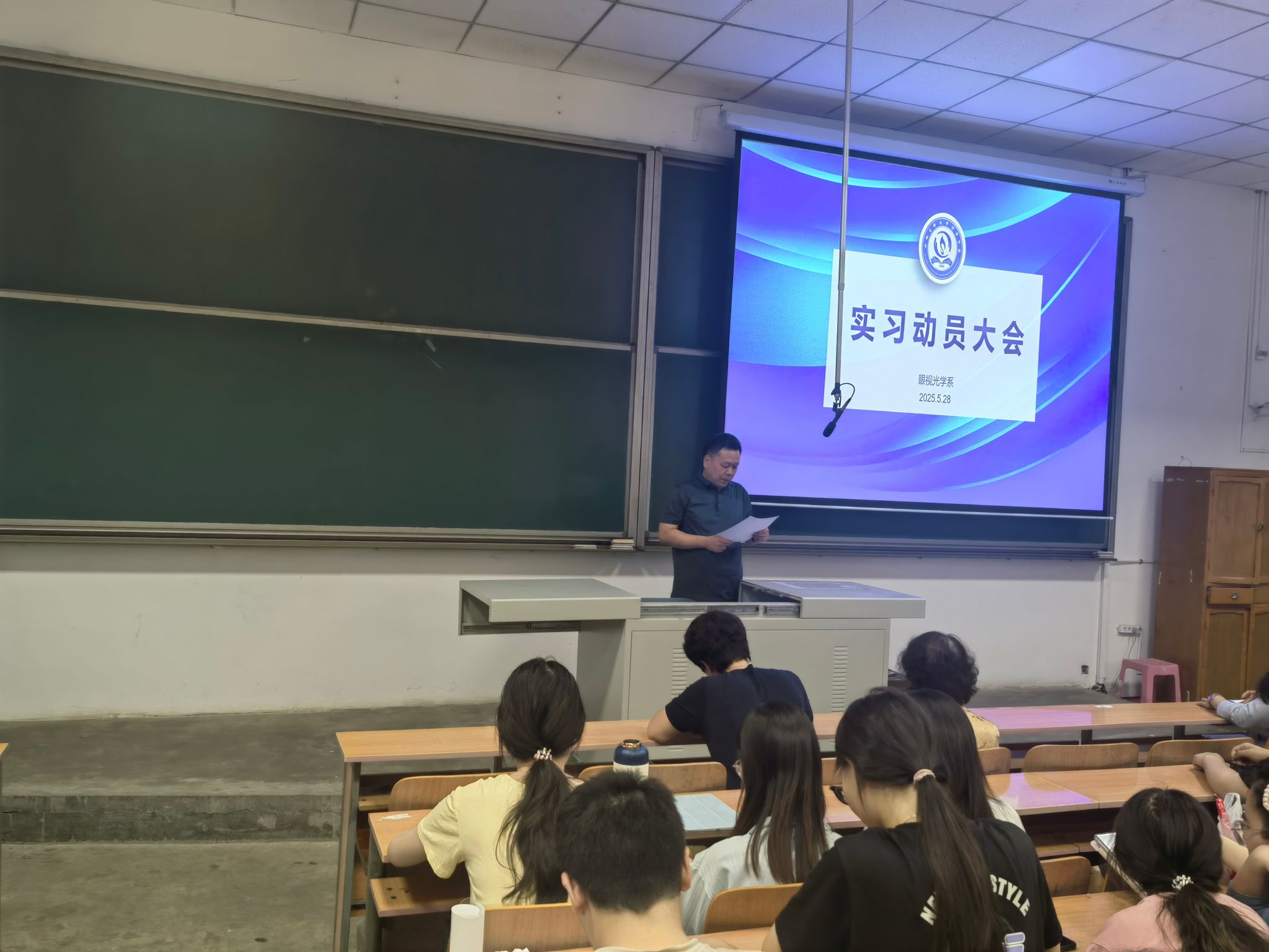 为帮助即将踏上实习岗位的学生明确实习目标、做好实习准备,眼视光学系于2025年5月28日在聚成楼一教室召开了2026届毕业生实习动员大会。参加动员大会的有眼视光学系党总支书记岳永红、系主任李春莺、党总支副书记张华,副主任张国华、眼视光学系2026届毕业生班辅导员阎艳萍、崔艳妮,学业导师何涛、张继云,及102201-5班和162201-4班全体学生。