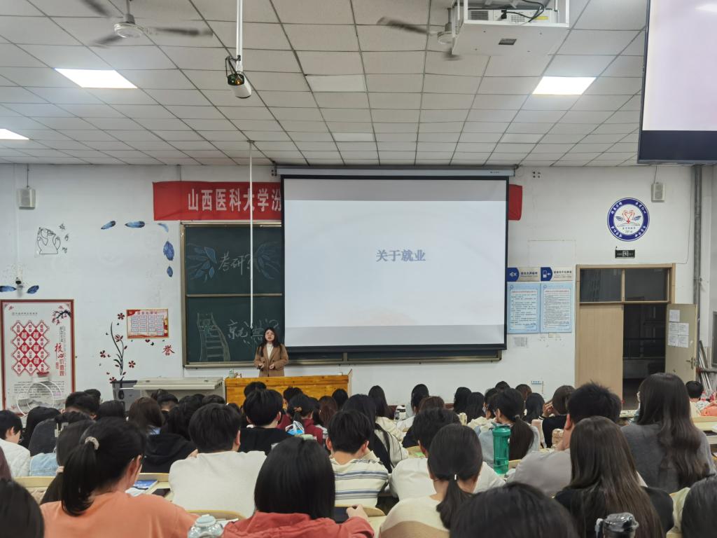 班会开始,赵秀敏老师首先提出问题、罗列数据。根据之前的调查统计显示,72101-8班有考研意向的同学占大多数,有就业、考公、考军队文职等意向的同学占少数比例。赵老师向同学们分享了自己的考研经历,启发大家应该给自己一个正确、客观、真实的评价,进而思考规划未来的重要意义。随后,就“如何获取关于就业方面的信息”这一问题,赵老师采用对比法,分别从国考和军队文职考试两个方面为同学们进行了认真详细的解答。与此同时,赵老师将“山西公考网”、“阳光招考网”、“山西医考信息网”等公众号推荐给大家,以便于帮助同学们后期有效地获取相关信息。