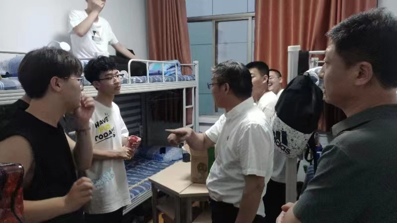 在男生公寓,杨兴益主任、高瑞忠副主任仔细查看了宿舍里的设施设备,并与同学们亲切交谈,详细了解大家在学习、生活等方面的情况,询问同学们的学业规划和职业理想,嘱咐同学们要勤奋学习,加强锻炼,劳逸结合,珍惜大学时光,“立长志,树大德”。
